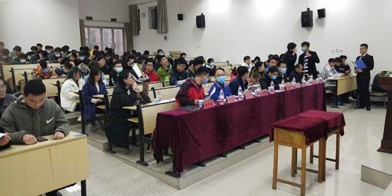 此次竞赛由党委副书记杨国洲老师主持,学院副院长王仪老师、团学办主任魏艳楠老师、学工办副主任朱松岭老师、参赛队伍指导老师、辅导员老师以及团员青年代表参加。比赛在雄壮的国歌声中活动拉开了序幕。党委副书记杨国洲老师致开幕词,参赛小组通过PPT的形式向评委老师介绍创作的作品,并对评委的提问进行答辩。比赛过程中参赛选手沉着冷静、思路清晰,充分展示了各自作品的特色和创新成果。最后,评委与参赛队伍进行合影留念。